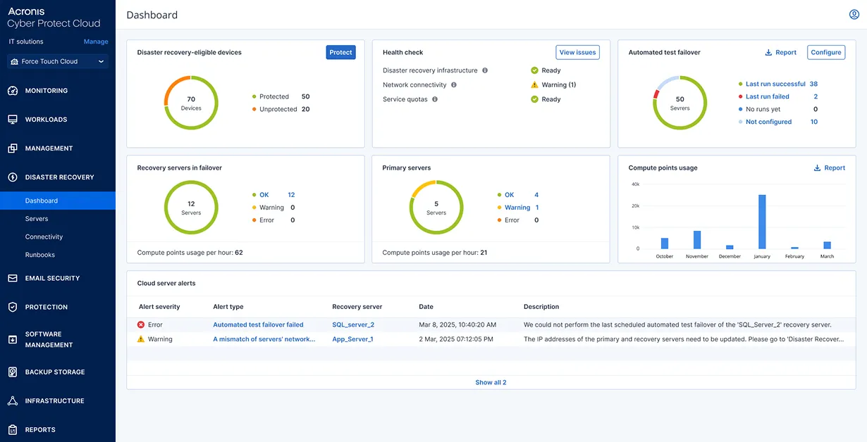 Enabling swift recovery from breaches and outages by facilitating seamless failover to secure cloud replicas of applications and data. Ensuring critical operations can resume quickly. Before restoring to your primary site, cloud replicas are scanned for vulnerabilities and malware, ensuring a safe and clean recovery process and business continuity.